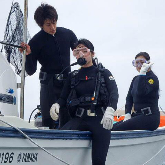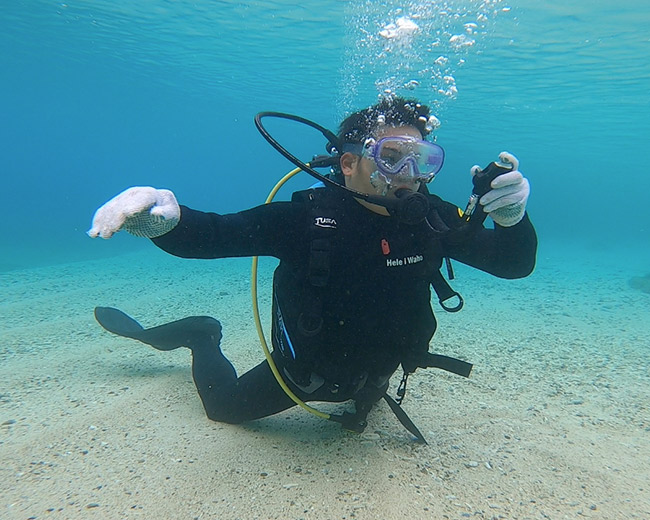 初めは足の届く浅場でしっかりスキルを学びながら海と器材に身体をならしていきます。